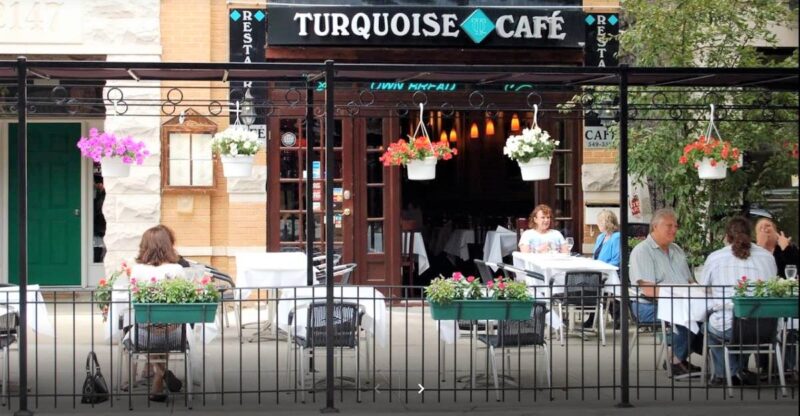 蓝绿色的餐厅:为了获得更高档的用餐体验,罗斯科村的居民转向绿松石,在白色桌布的背景下提供现代土耳其美食。